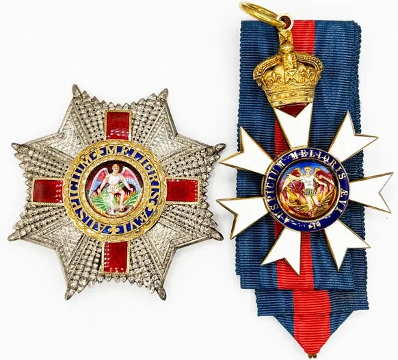 The Most Distinguished Order of St. Michael and St. George, K.C.M.G. Knight Commander’s set of insignia, comprising neck badge, silver-gilt and enamels, and breast star, silver, with appliqué centre in gold and enamels.